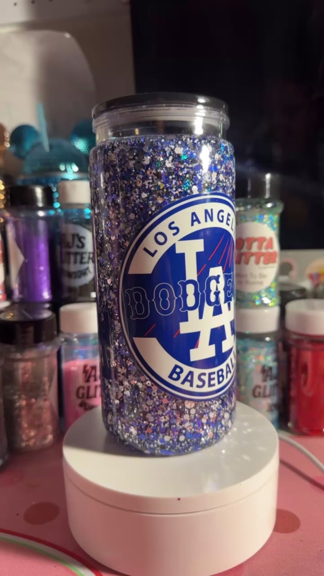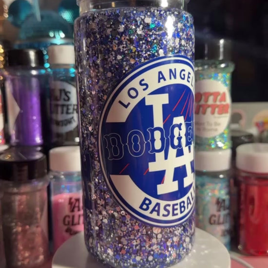 Suspended flow (will settle after 3-5 hours, shake to reactivate) with shades of blue, silver, black, and white glitter to match the amazing Los Angeles baseball team colors and polymer clay baseballs. Black colored lid included. Cup is acrylic, NOT GLASS.